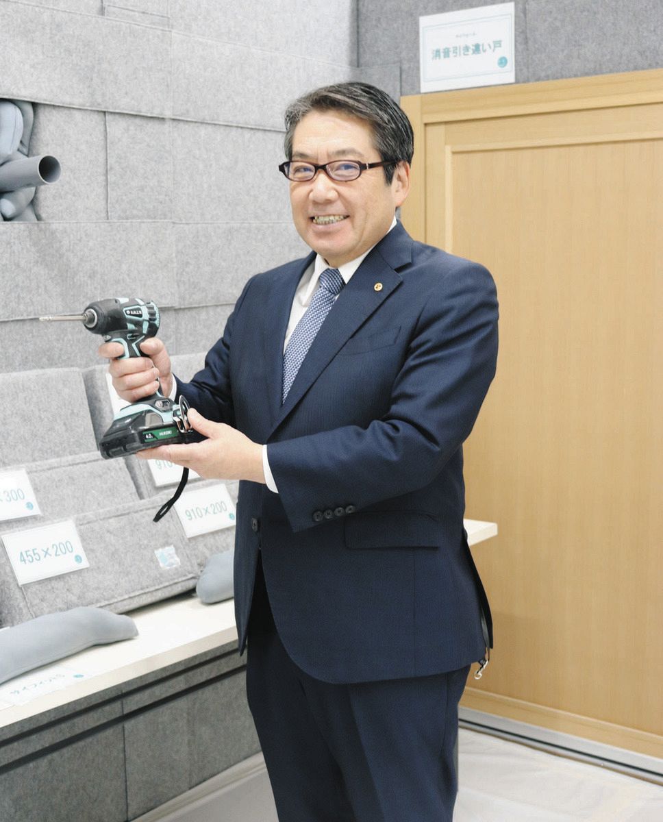 工事現場の消音仮設壁の前で施工時の振動・騒音を抑えるサイレントシステムのドライバーを紹介する高木一昌社長=東京都豊島区で