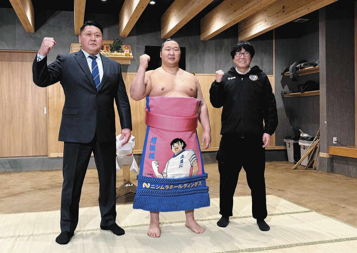 大空翼の化粧まわしをした旭海雄関(中)と大島親方(左)、高橋陽一さん=葛飾区の大島部屋で