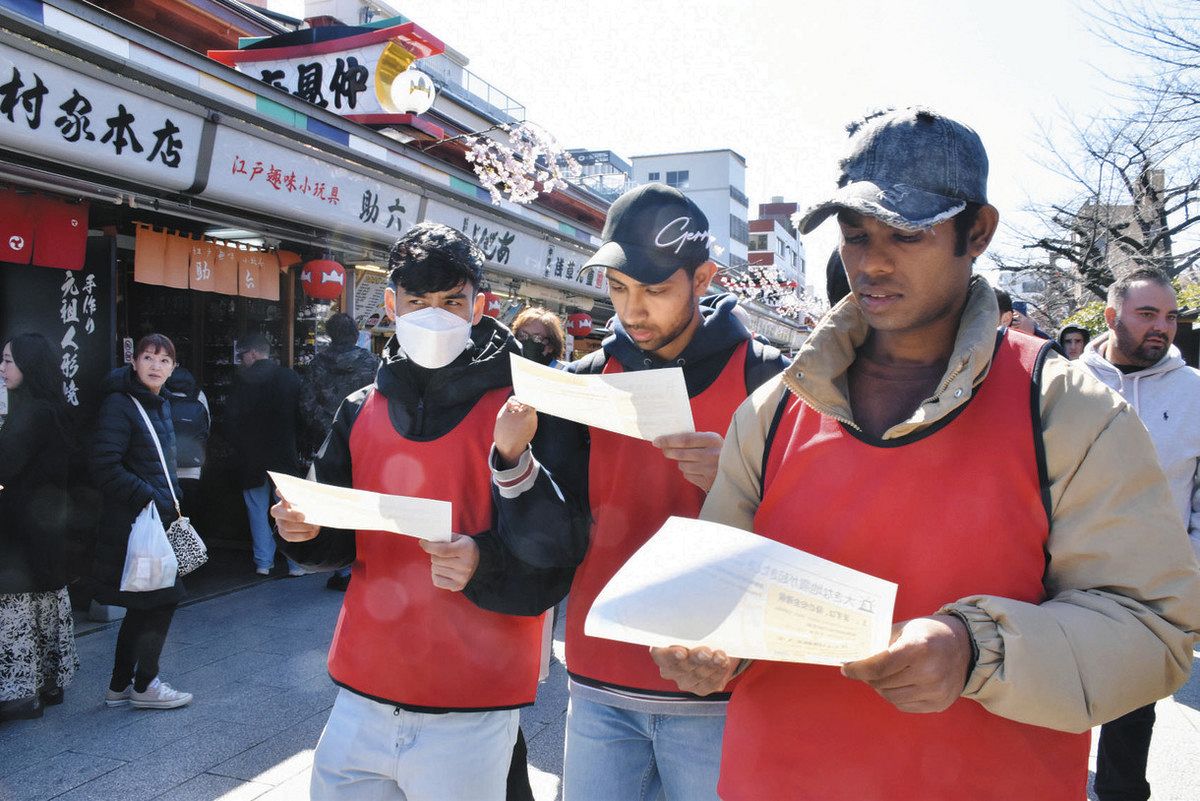 東日本大震災から11日で15年になるのを前に、外国人観光客らでにぎわう東京都台東区浅草で5日、大規模地震の発生に備え、帰宅困難者や観光...